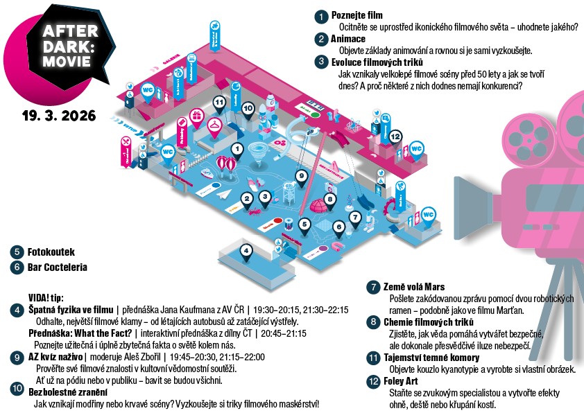 Vyzkoušejte si nový exponát VIDA! a přehrajte si slavné filmové hlášky. Schválně, jestli poznáte, z jakého jsou filmu. Projdete se po červeném koberci jako skutečná celebrita, necháte se zachytit objektivy novinářů. Domů si odneste fotografii vlastnoručně vyvolanou v temné komoře.